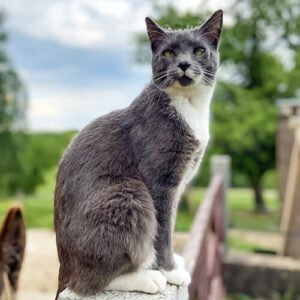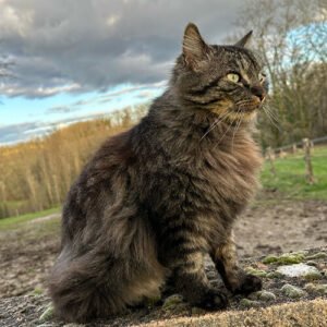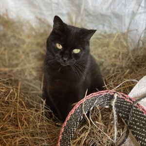 Alfred – found locally aged around 3 weeks. He had coryza (cat flue) and was really skinny. Soon nursed back to health he and Bertie (who was found dumped around the same time) grew up together the best of friends. Alfred loves to photo bomb the donkeys 😘