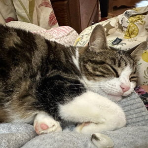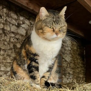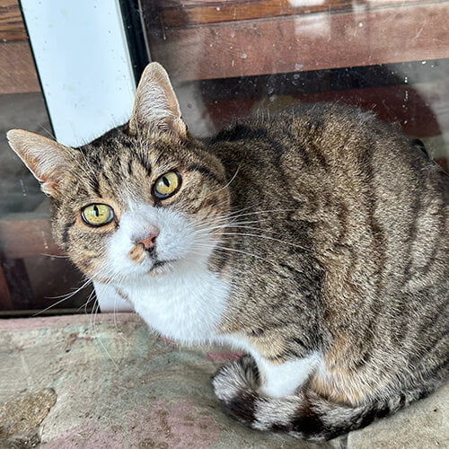 Nugget – found wandering down the middle of a country lane aged around 3 weeks. Teeny tiny Nugget was with other kittens that had obviously been dumped. One died of a virus and although Nugget was the smallest she was the least affected by it. She did however get knocked by a car when she was a few years old and had to have her tail amputated. She’s a favourite with the volunteers and jumps from lap to lap at coffee time.
