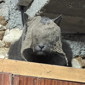Teddy – one of a litter of 4 to a semi feral mum and then not handled for 11 weeks. He’s remained very very shy and not liked by some of the other cats for some reason. This picture was taken when he had been up high in the barn 🙈 He’s a very pretty cat without his web outfit 😂❤️